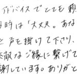 2026年2月26日 / 最終更新日 : 2026年2月26日 アシスト良縁 成婚者の口コミ 20歳代女性会員様(活動際6ヶ月/交際4ヶ月) 会員様より嬉しいご感想をいただきましたのでご紹介いたします。 困った時は 的確なアドバイスでとても頼りになりました! 気持ちが沈みそうな時は「大丈夫。あなたは素敵だから良い人に出会えるよ」と声を掛けて下さり、がんばろうと […]