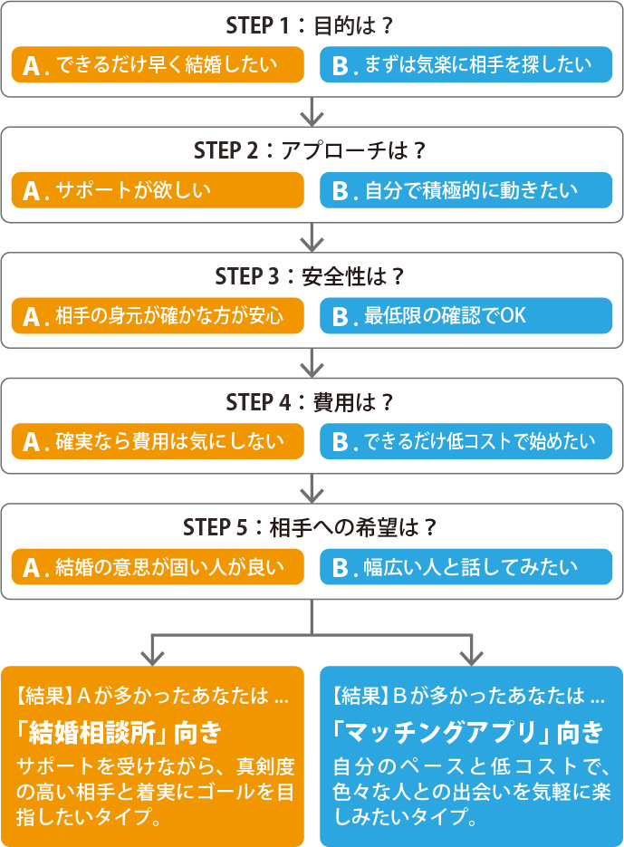 この「婚活タイプ診断フロー」は、5つの質問に直感で答えるだけで、あなたに最適な婚活方法が「結婚相談所」と「マッチングアプリ」のどちらかかを導き出します。