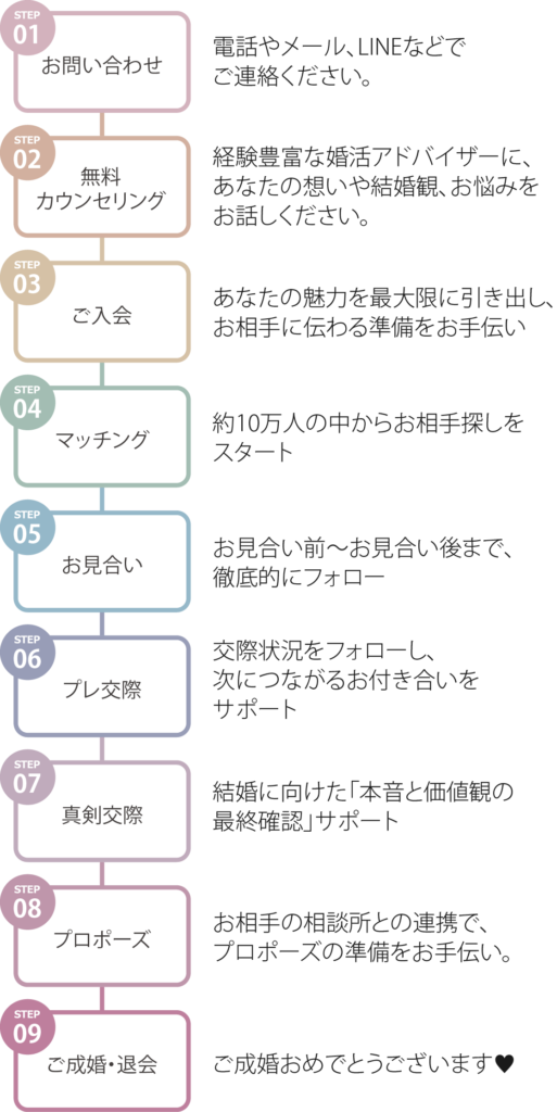 このロードマップでは、エニアグラム分析に基づいた徹底的な準備と、お見合い・交際における次のアクションまで、プロが隣で伴走し、あなたの貴重な時間を使って最短距離でゴールを目指します。