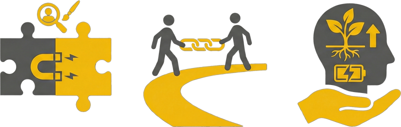 マッチング率を高める「出会いの技術」、交際を深める「関係構築ノウハウ」、そして活動を支える「内面サポート」という3つの戦略を軸に、成婚というゴールまで着実に導きます。